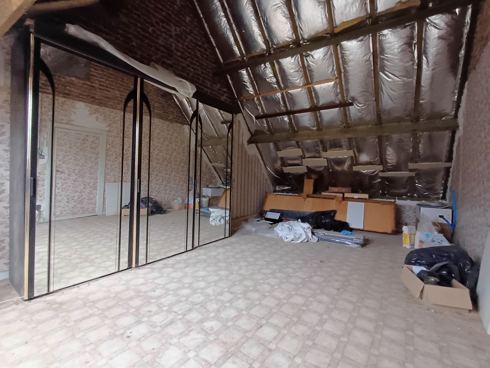 Op de zolderverdieping bevinden zich twee slaapkamers, waarvan één met een kleine opbergruimte of mogelijke dressing. Beide ruimtes wachten op uw creatieve touch om volledig afgewerkt te worden.