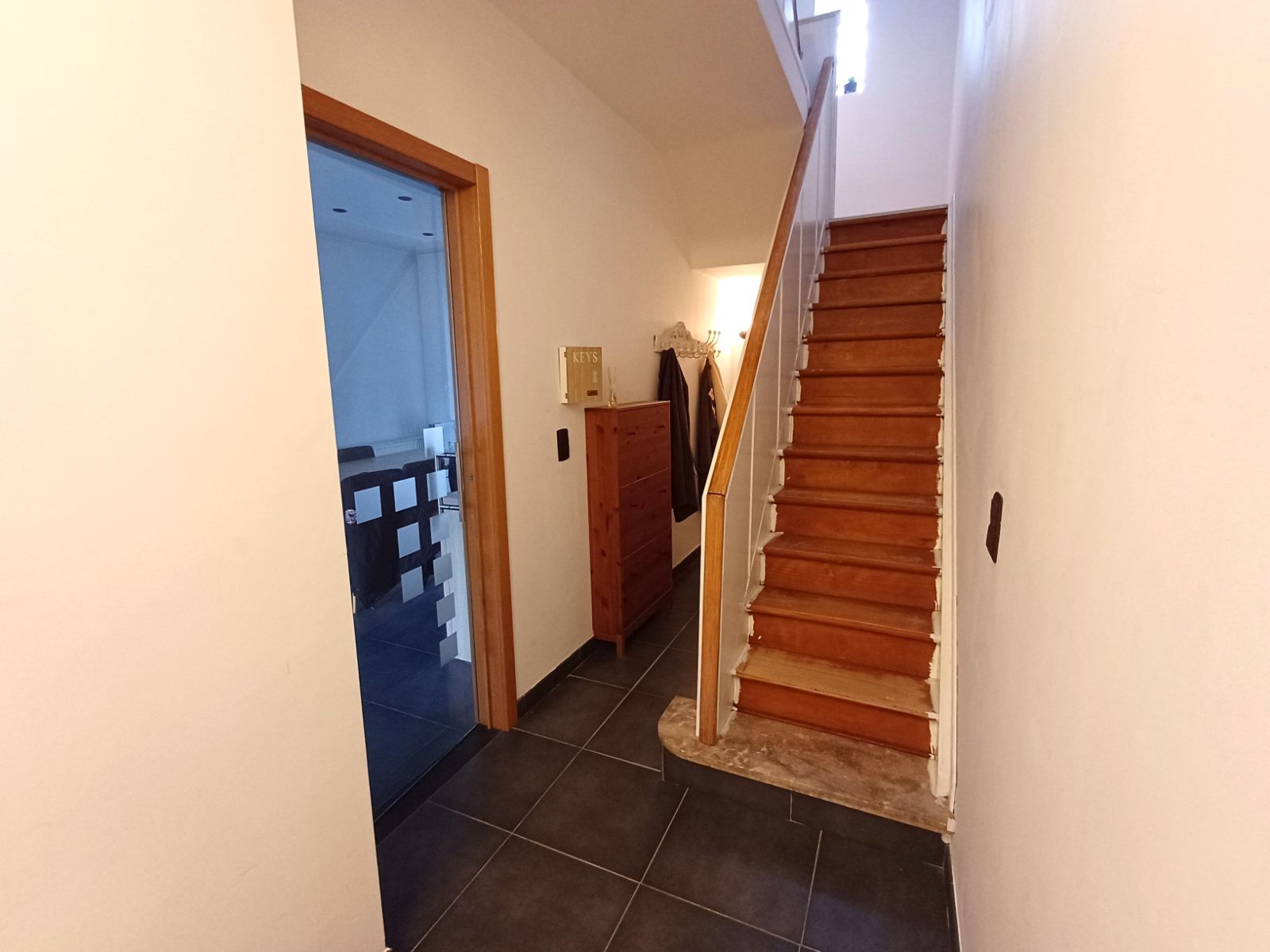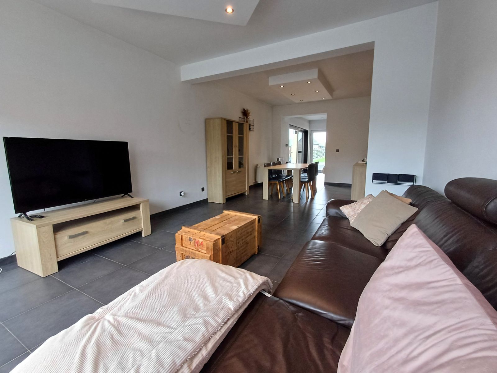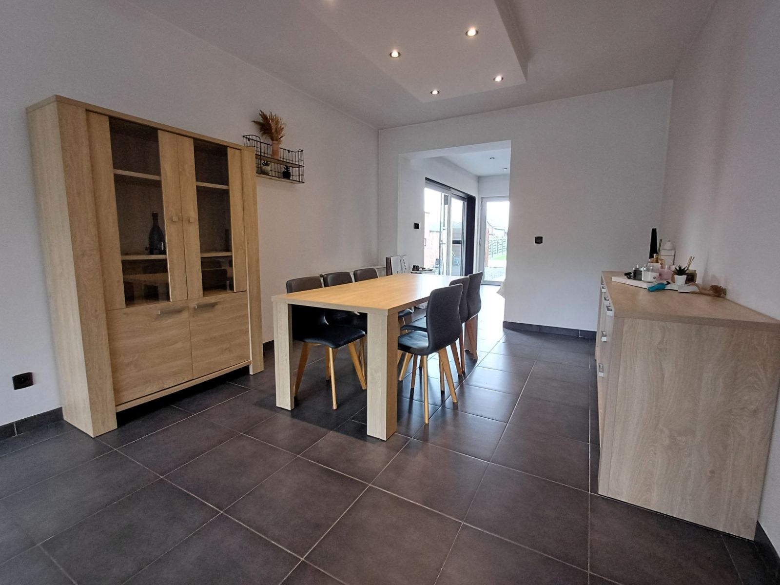 - U betreedt de woning via de inkomhal, die toegang biedt tot de kelder en de open leefruimte. De leefruimte is gezellig en functioneel ingedeeld, met een comfortabele zithoek en een eetgedeelte, volledig geïntegreerd met een lichte en praktische keuken. Via een schuifdeur stap je rechtstreeks het zonnige terras op en ontdek je de ruime, groene tuin, ideaal voor ontspanning, buitenactiviteiten of spelen met de kinderen.