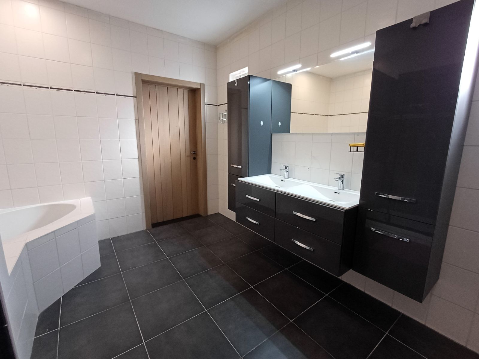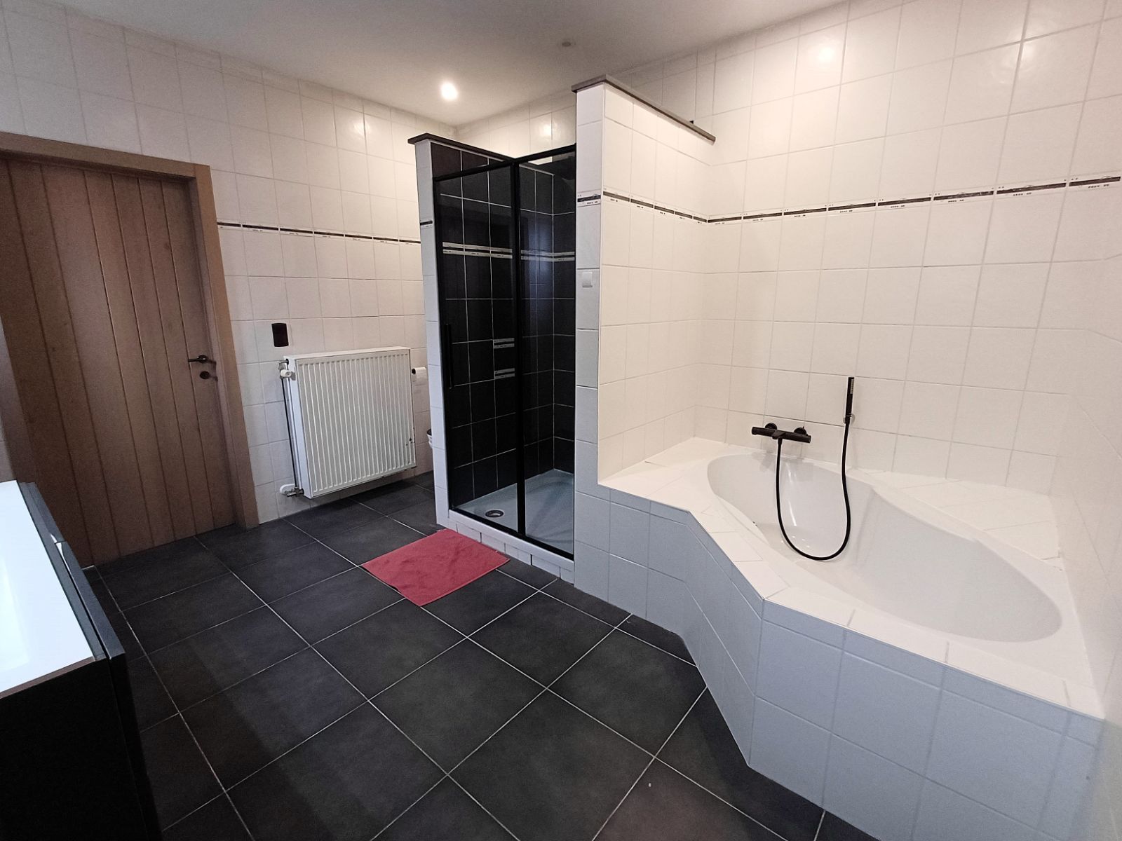 - De badkamer is bereikbaar vanuit de keuken en is uitgerust met een dubbele lavabo, een douche en een zitbad, volledig afgestemd op de noden van een gezin. Aansluitend bevindt zich een praktische berging met de technische installaties.