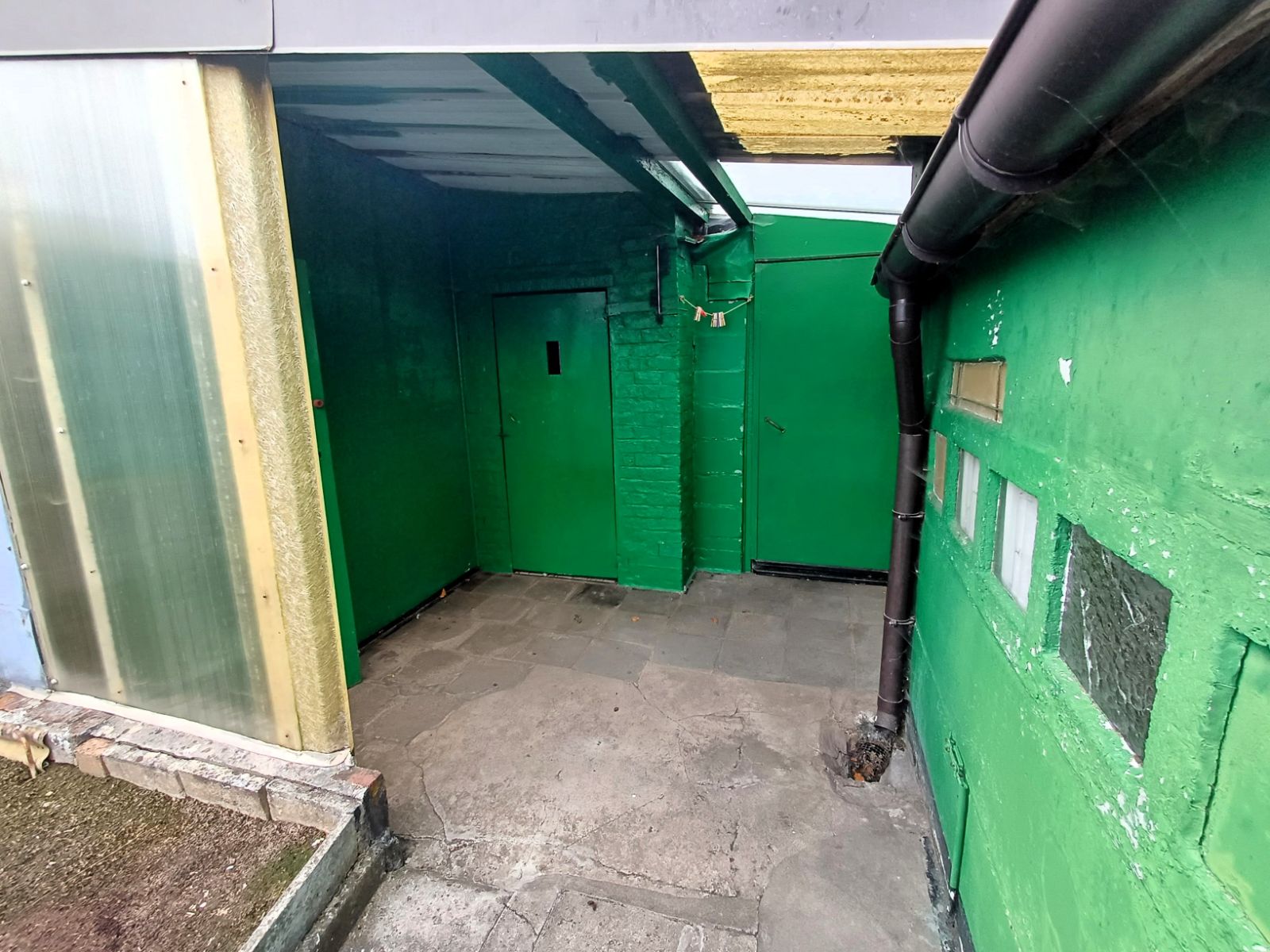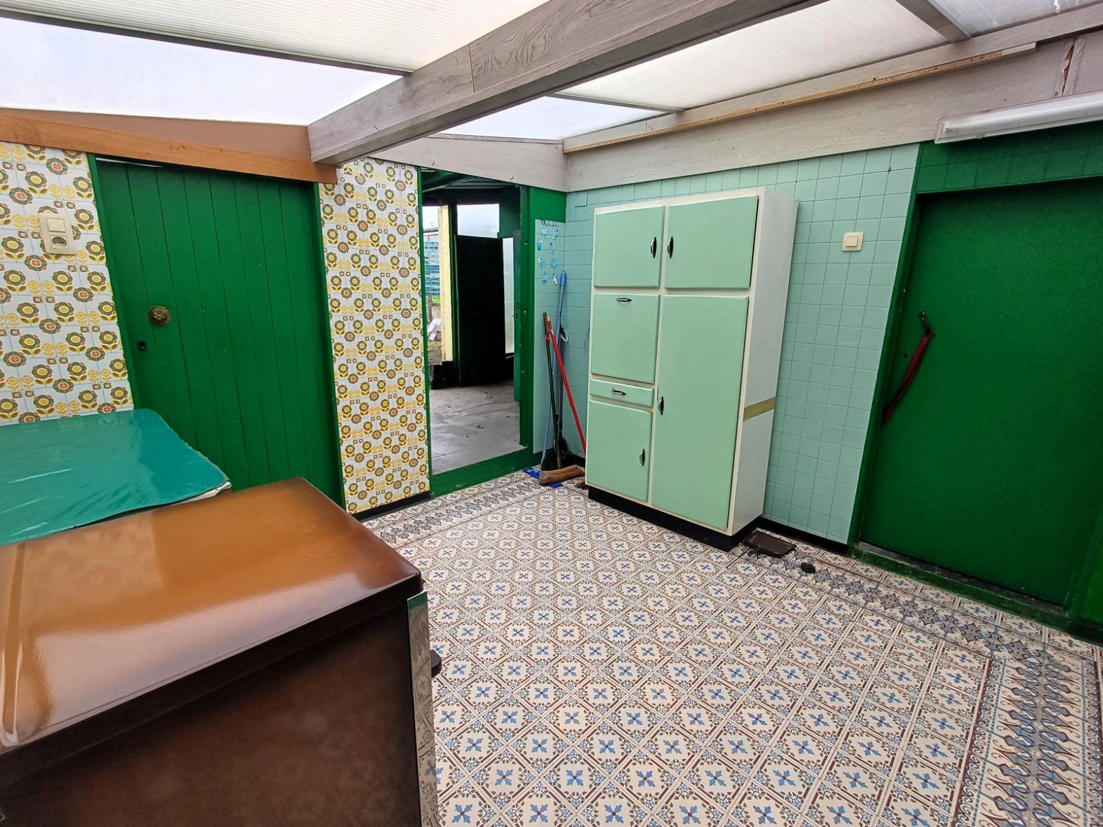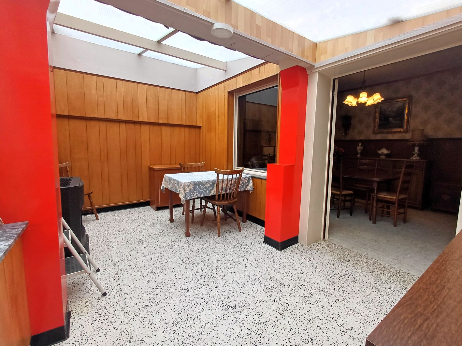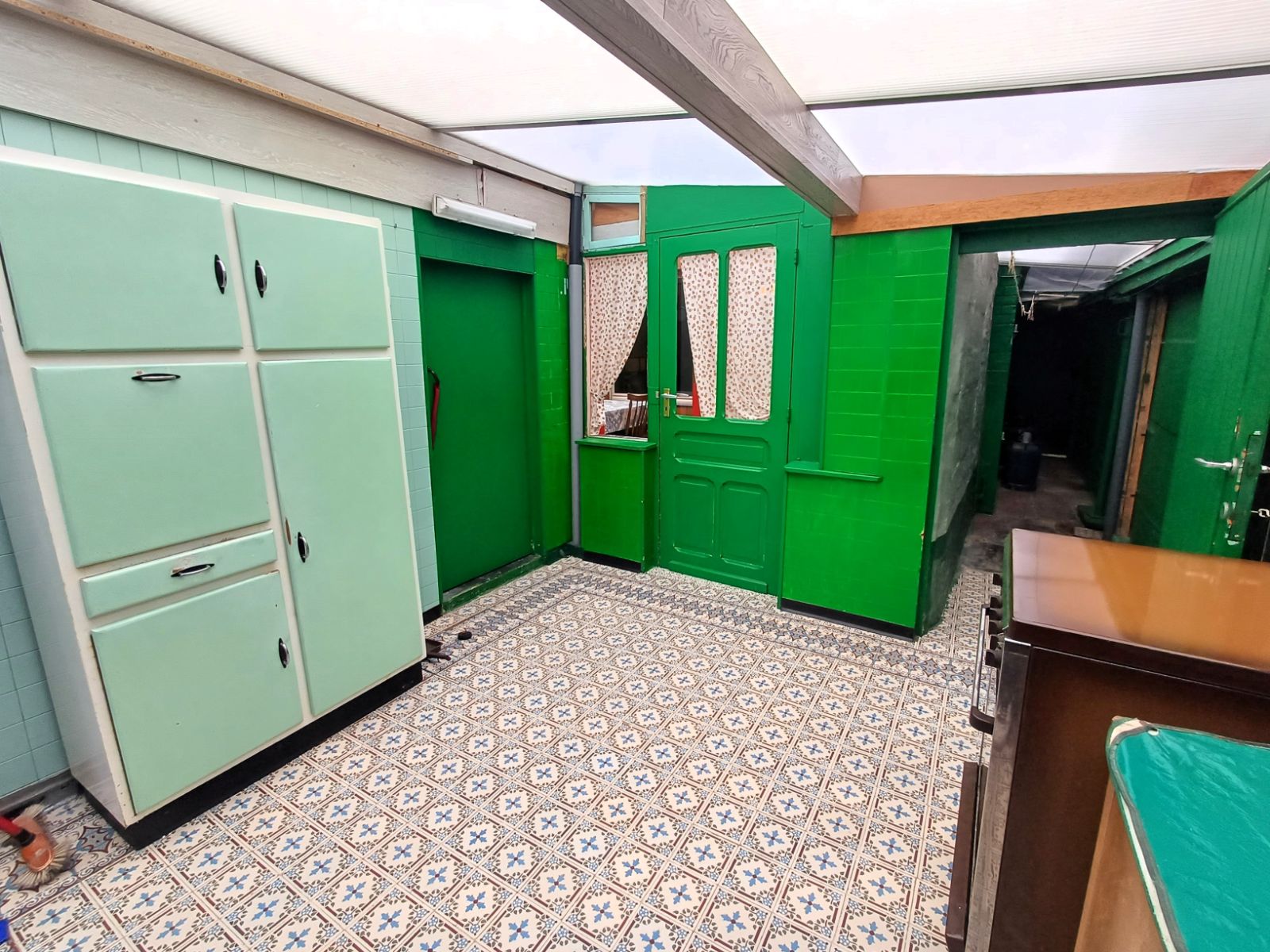 Via de inkomhal komt u binnen in het bureel en de leefruimte. Verderop bevinden zich de eetkamer, keuken, bijkeuken en meerdere bergingen. Achteraan zijn een extern toilet en extra buitenbergingen aanwezig, wat extra functionaliteit en opslagruimte garandeert. Een overdekte pandgang naast de woning leidt rechtstreeks naar de keuken.