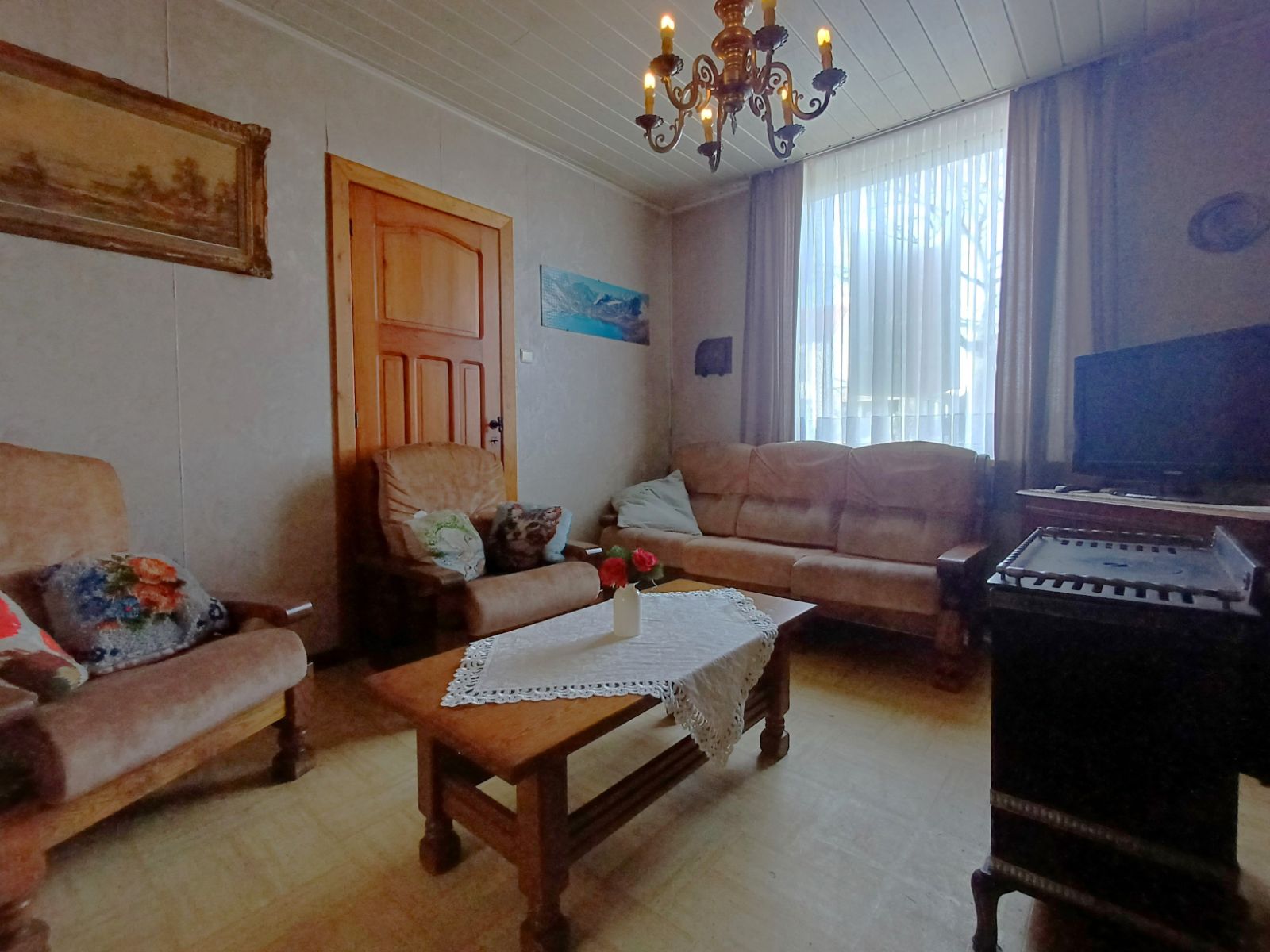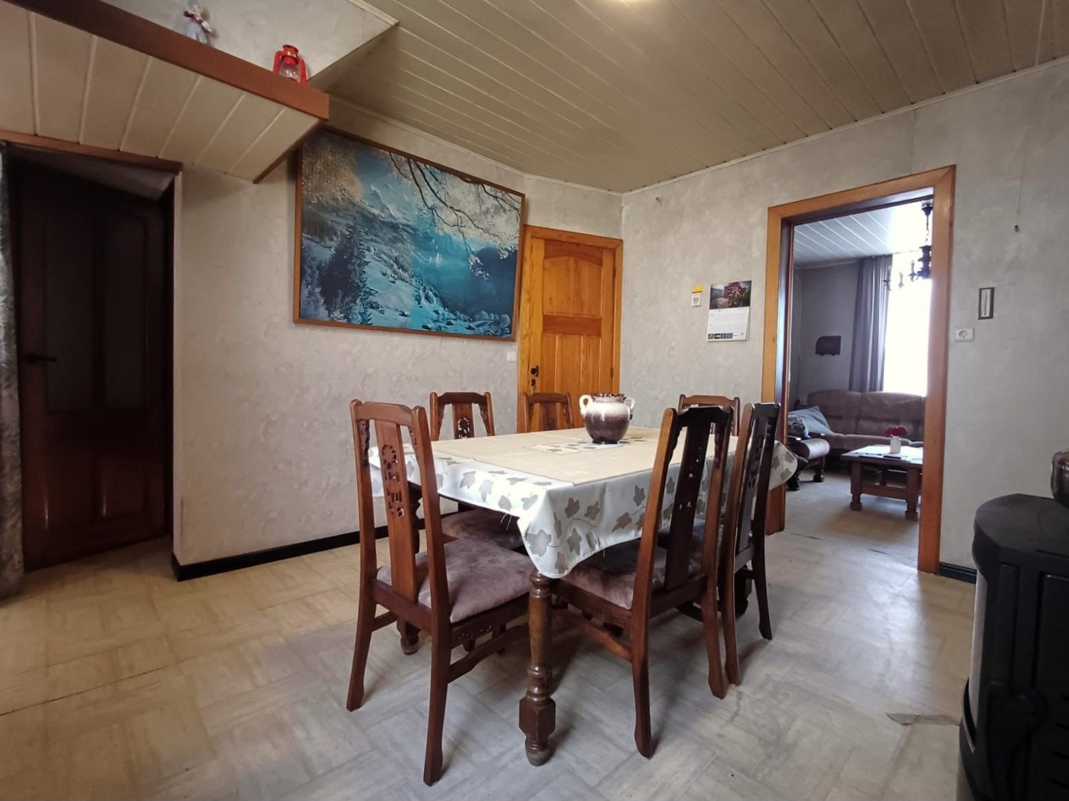 Op het gelijkvloers komt u binnen via de inkomhal met toegang tot de leefruimte, eetruimte en de trap naar de eerste verdieping. De leefruimte is voorzien van een gezellige houtkachel en sluit aan op de eetruimte, die uitgerust is met een mazoutkachel. Vanuit de eetruimte is er toegang tot de ruime en droge kelder, opgedeeld in twee afzonderlijke ruimtes, evenals tot de keuken. De keuken vormt de verbinding naar de badkamer, de eetruimte en de buitenkoer.
