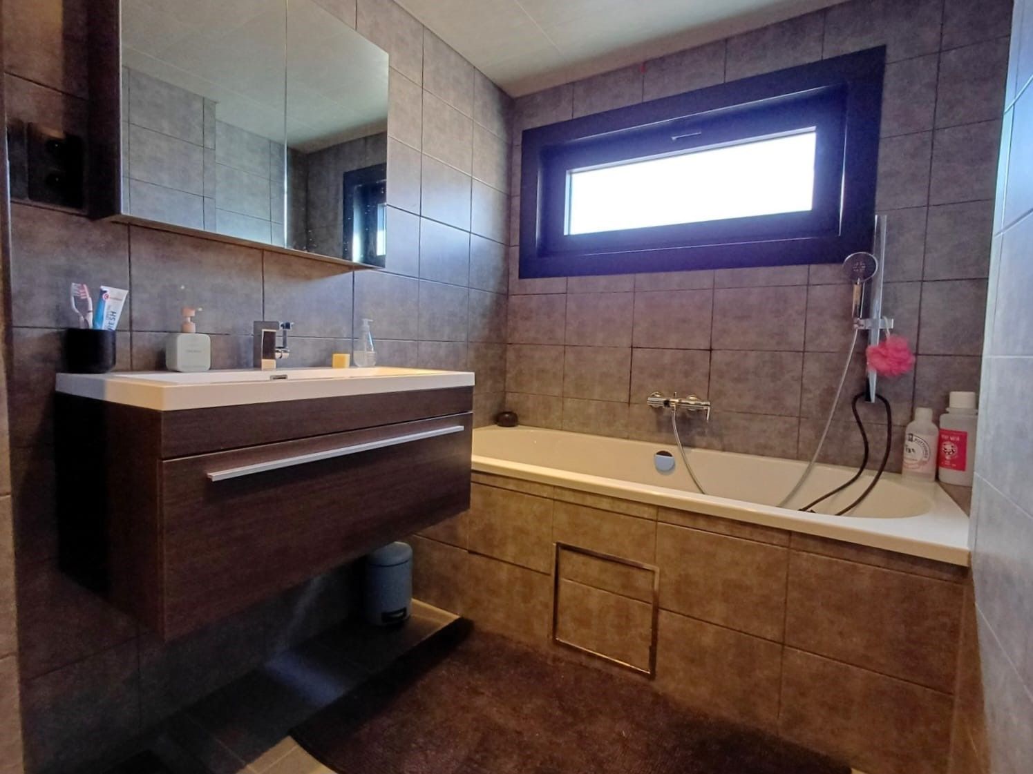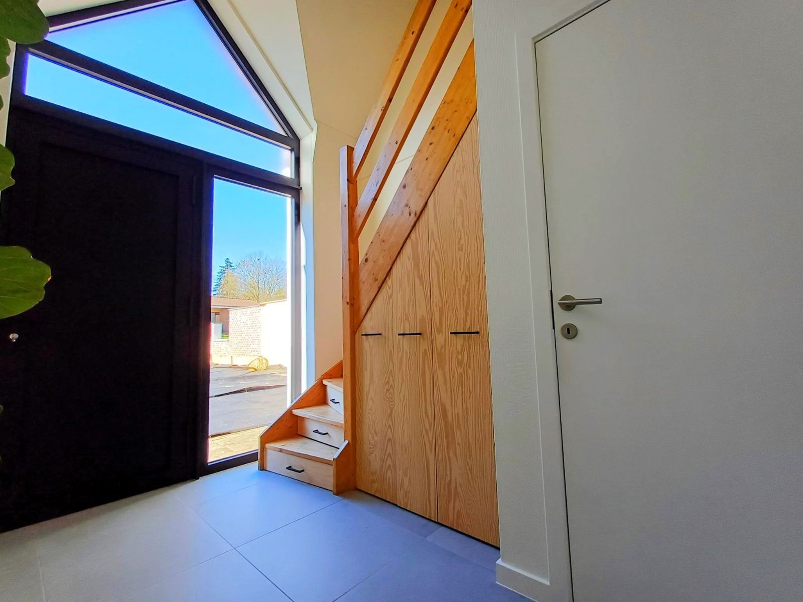 Bij het binnenkomen wordt u verwelkomd in de inkomhal, voorzien van een ingebouwde kast en handige lades ingewerkt in de trap, ideaal voor extra opbergruimte. Verder vindt u op het gelijkvloers een apart bezoekerstoilet.