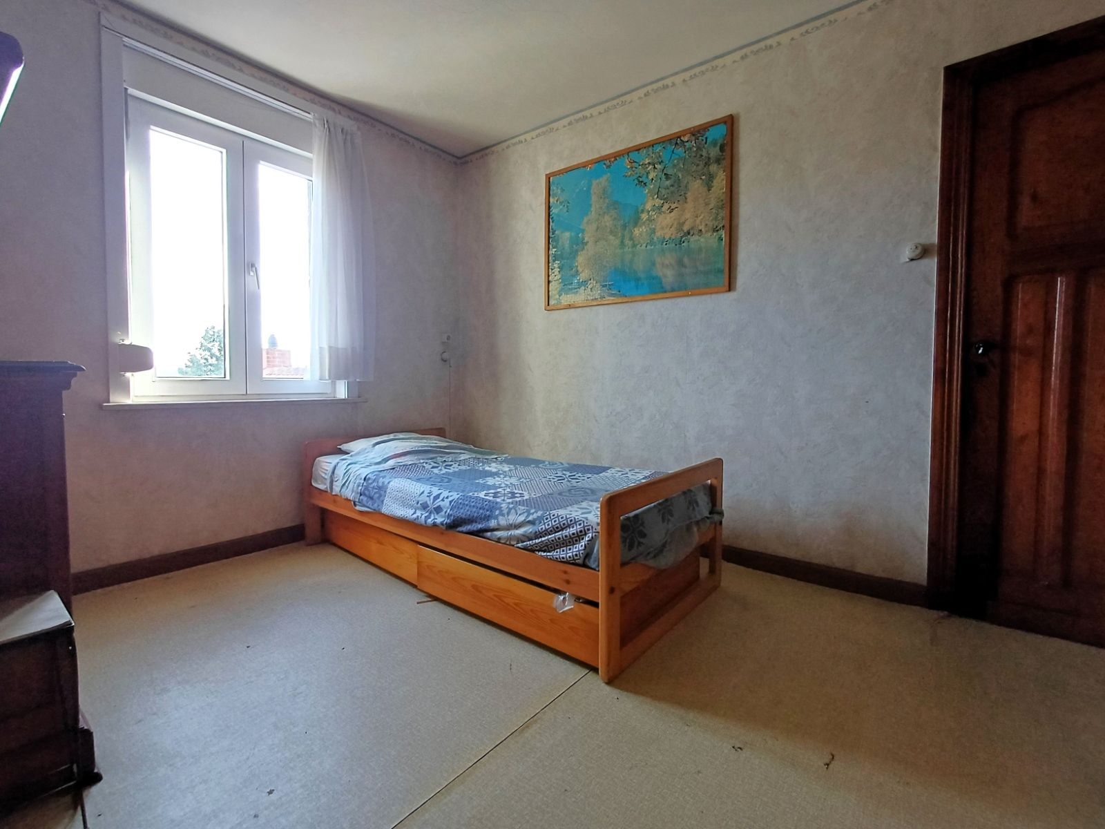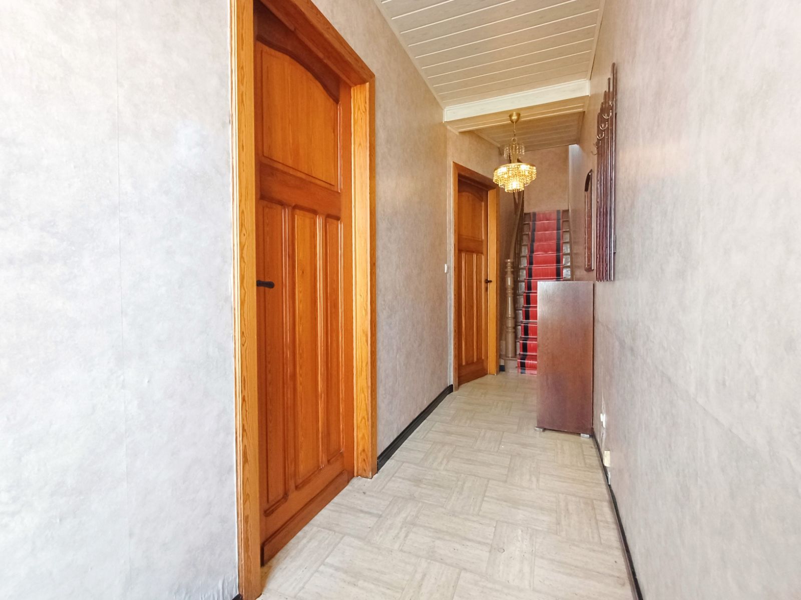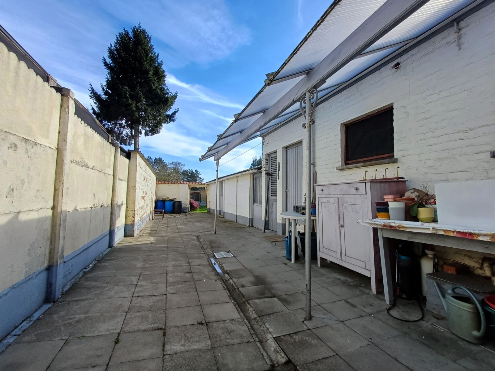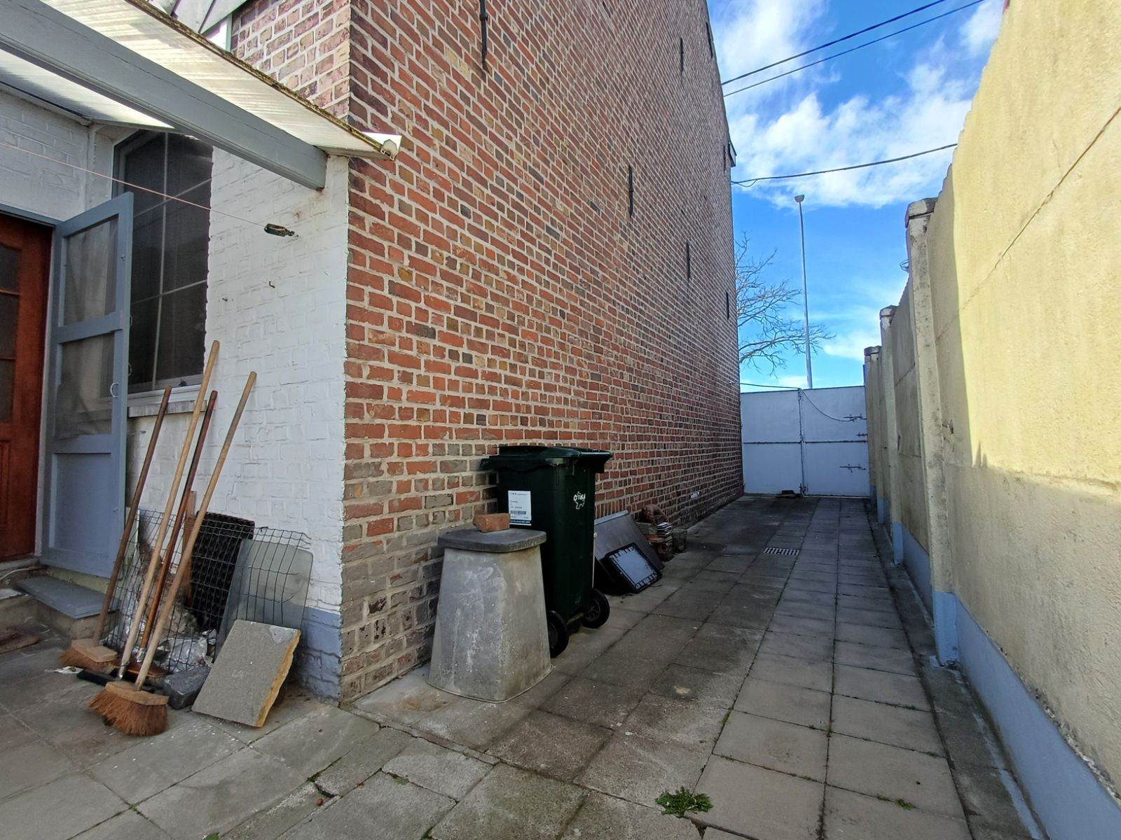 De woning beschikt over een praktische zijdoorgang van ca. 1m90 breed, die zorgt voor een vlotte verbinding naar de straat en de binnenkoer , ideaal voor fietsen, tuinmateriaal of het eenvoudig bereiken van de buitenruimte zonder door de woning te moeten.