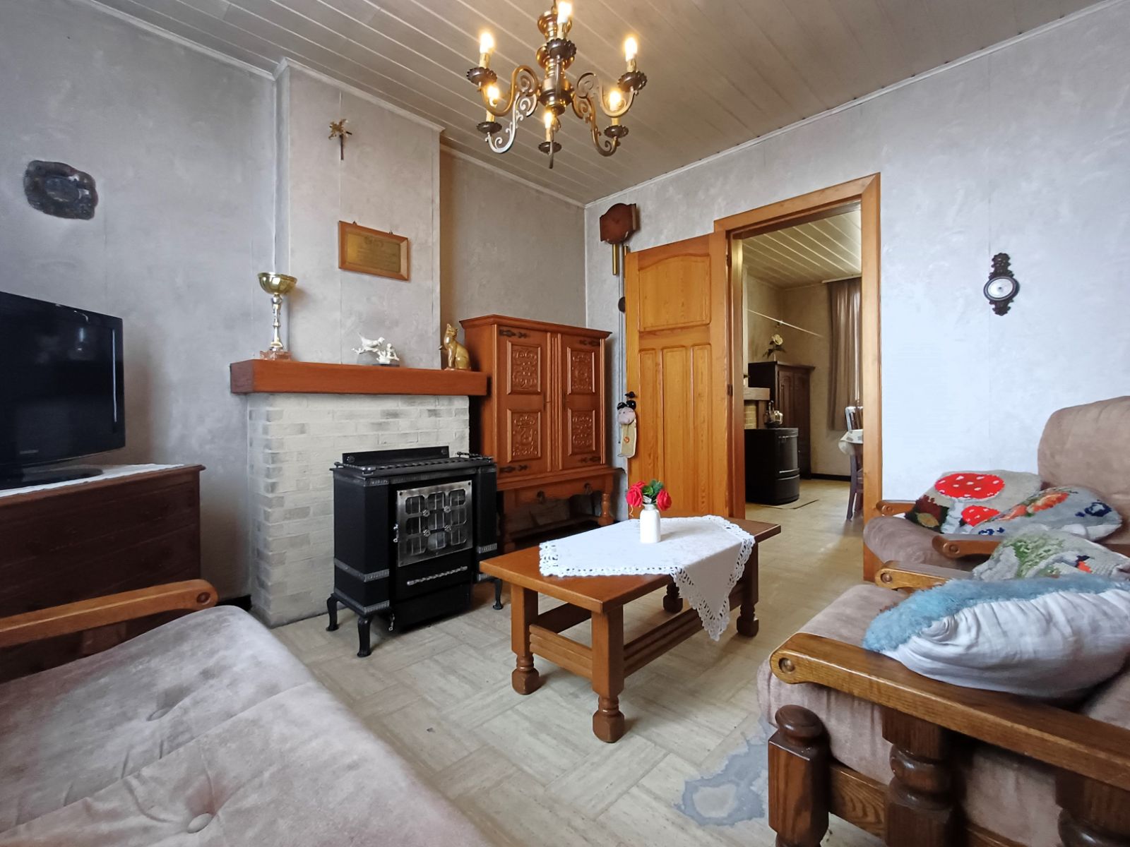 Op het gelijkvloers komt u binnen via de inkomhal met toegang tot de leefruimte, eetruimte en de trap naar de eerste verdieping. De leefruimte is voorzien van een gezellige houtkachel en sluit aan op de eetruimte, die uitgerust is met een mazoutkachel. Vanuit de eetruimte is er toegang tot de ruime en droge kelder, opgedeeld in twee afzonderlijke ruimtes, evenals tot de keuken. De keuken vormt de verbinding naar de badkamer, de eetruimte en de buitenkoer.