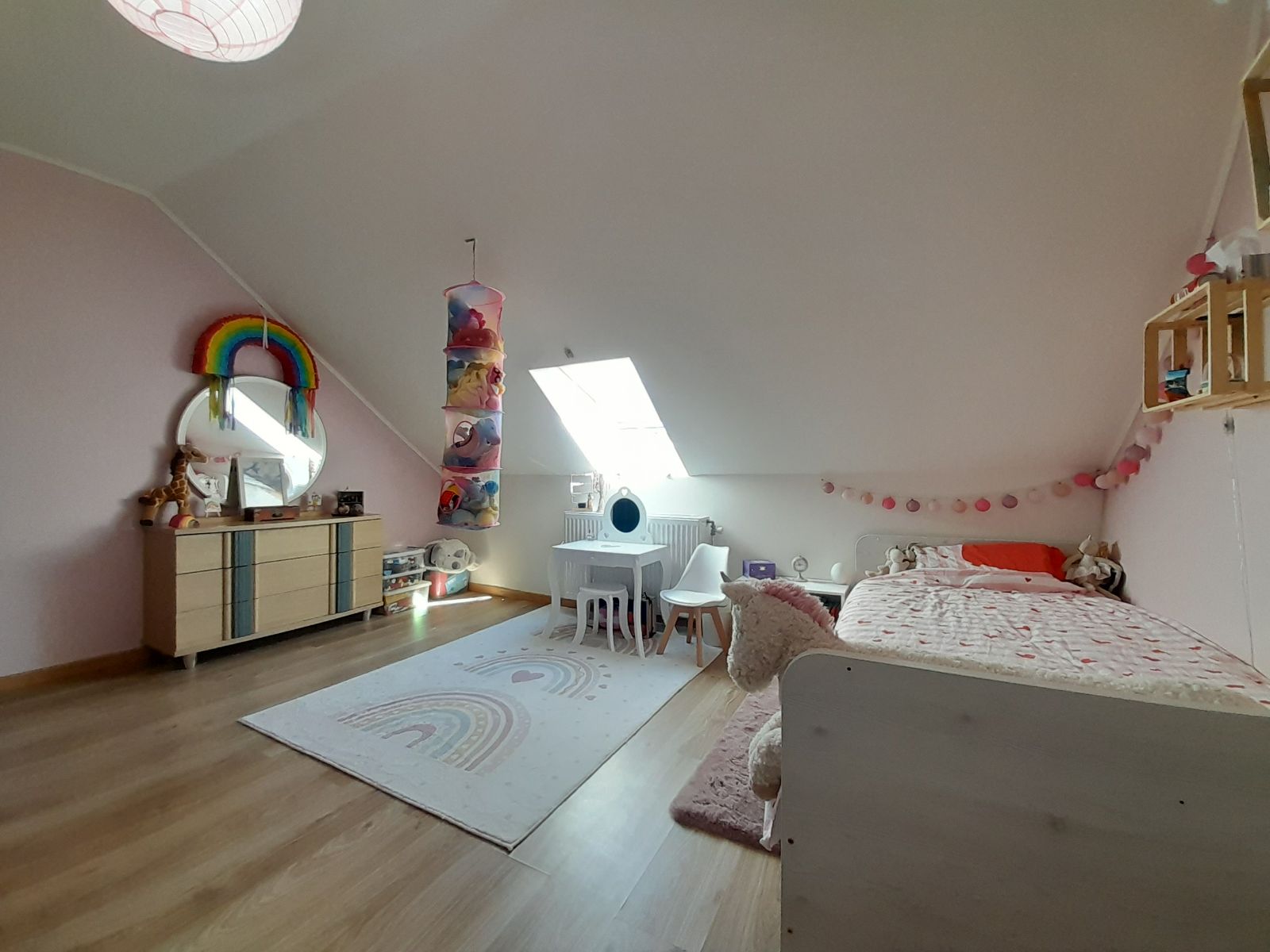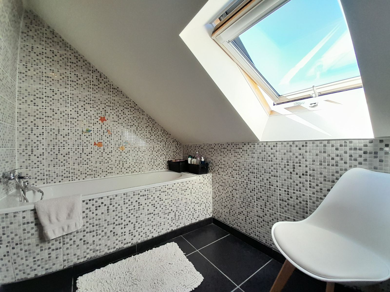 Un escalier fixe vous mène au grenier aménagé, où se trouve une troisième chambre spacieuse avec une seconde salle de bain équipée d’une baignoire et d’un lavabo.