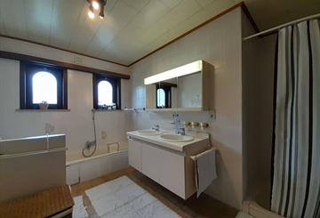 Badkamer met ligbad, toilet, dubbele wastafel en douche |