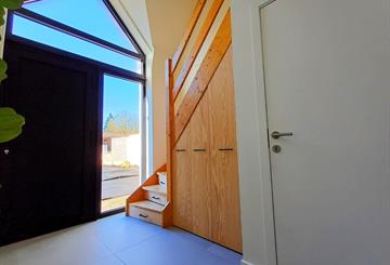 Bij het binnenkomen wordt u verwelkomd in de inkomhal, voorzien van een ingebouwde kast en handige lades ingewerkt in de trap, ideaal voor extra opbergruimte. Verder vindt u op het gelijkvloers een apart bezoekerstoilet.