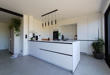 De woning opent zich vervolgens naar een prachtige, ruime leef- en eetruimte met open keuken. Dankzij de open indeling geniet u hier van een aangenaam gevoel van ruimte en licht. De keuken is zeer functioneel ingericht en beschikt bovendien over een aparte berging.