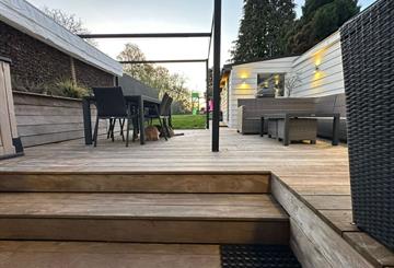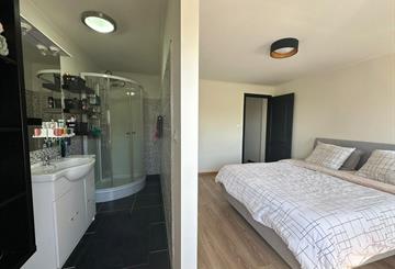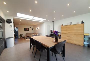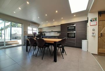 La maison dispose d’un espace de vie ouvert et lumineux, en parfaite harmonie avec une cuisine entièrement équipée avec coin repas. Depuis la cuisine, vous profitez d’une belle vue sur la terrasse et le jardin, créant une agréable continuité entre intérieur et extérieur. Atout supplémentaire : une installation de climatisation réversible (chaud/froid) ainsi qu’un poêle à pellets convivial.
