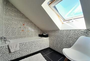 Un escalier fixe vous mène au grenier aménagé, où se trouve une troisième chambre spacieuse avec une seconde salle de bain équipée d’une baignoire et d’un lavabo.